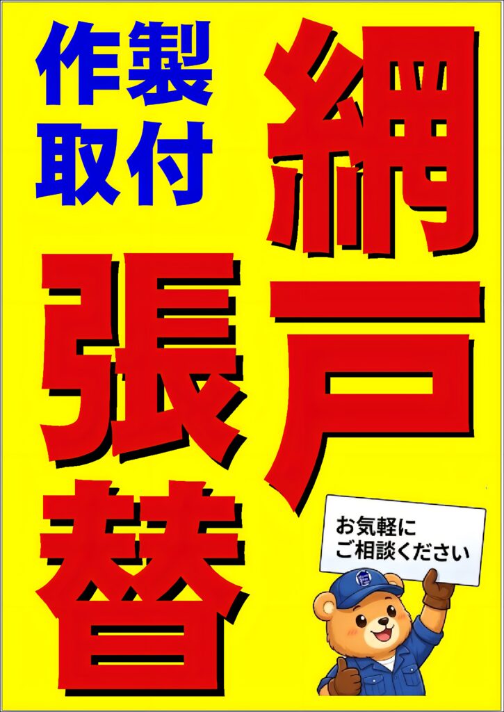 - 張替: 破れたネットを新品に。防虫効果の高い高密度メッシュも選べます。ペット対策用の張替えも可!