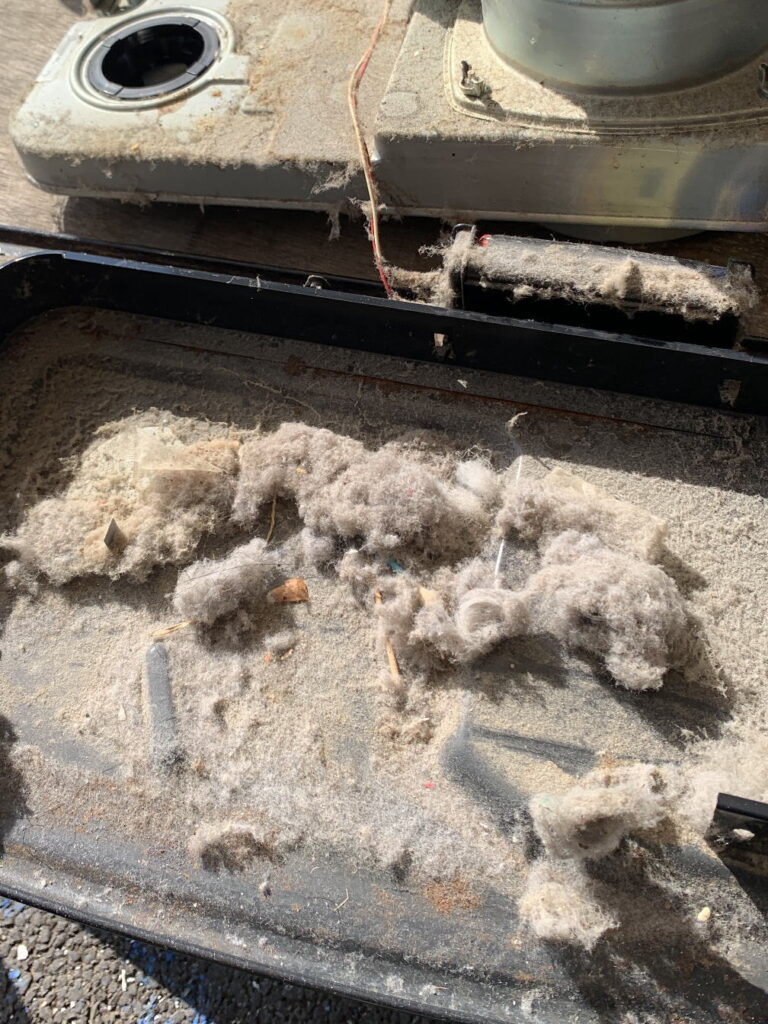 内部を開けてみると、燃焼部周辺に大量のホコリが蓄積している状態が確認できました。