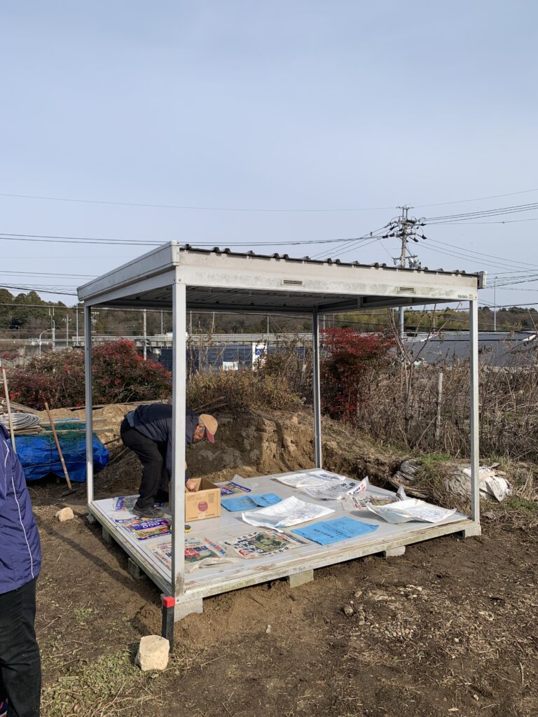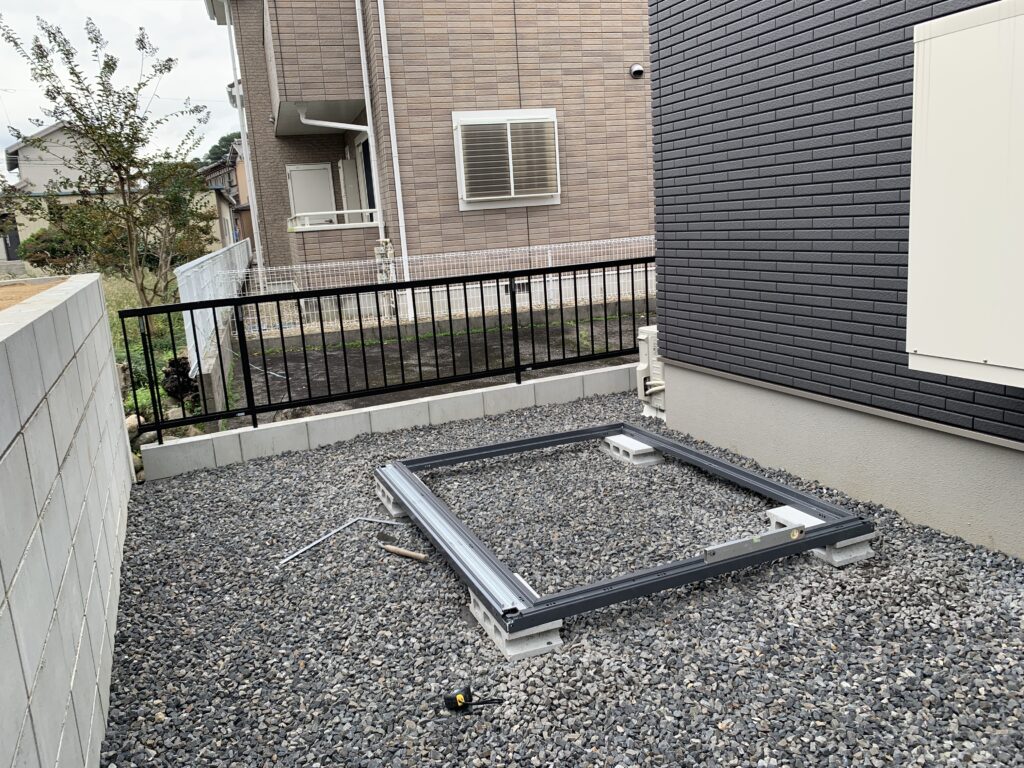 砂利の敷き詰められた敷地内で、後々沈むことの無い様基礎をしっかりと設置したうえで施工しております。