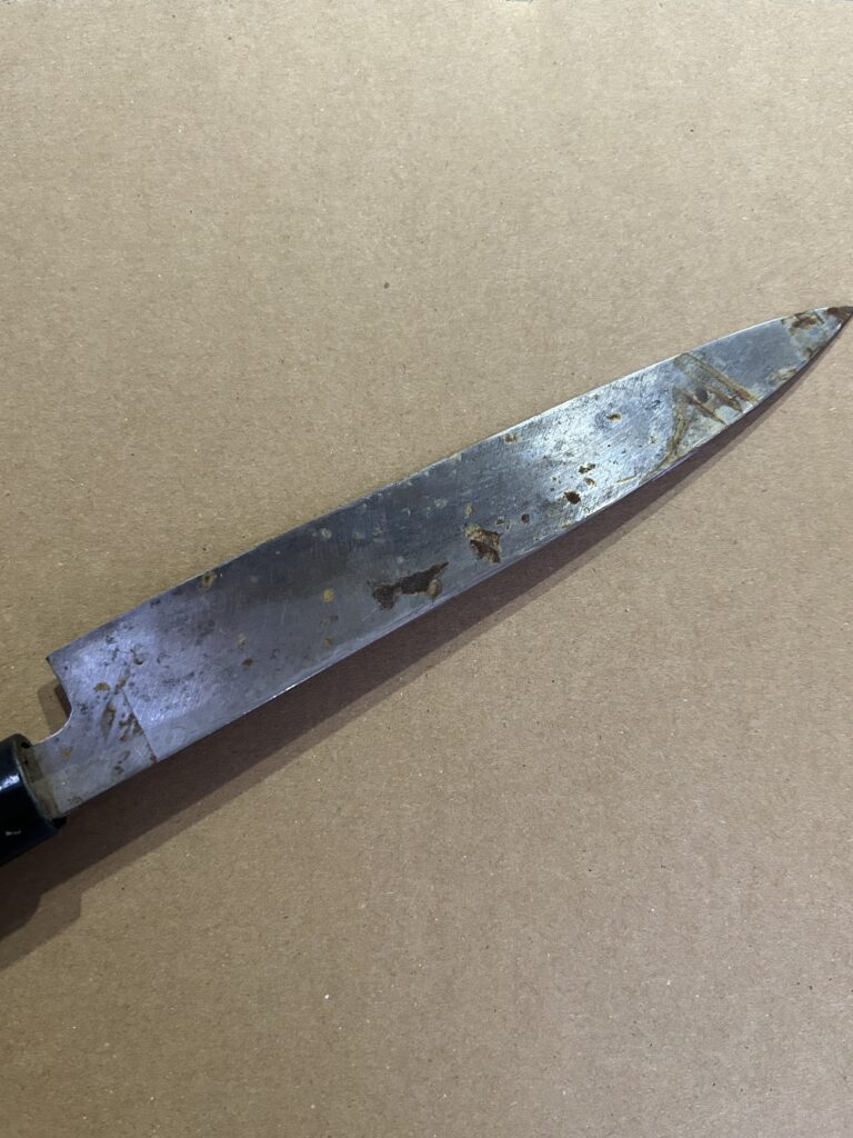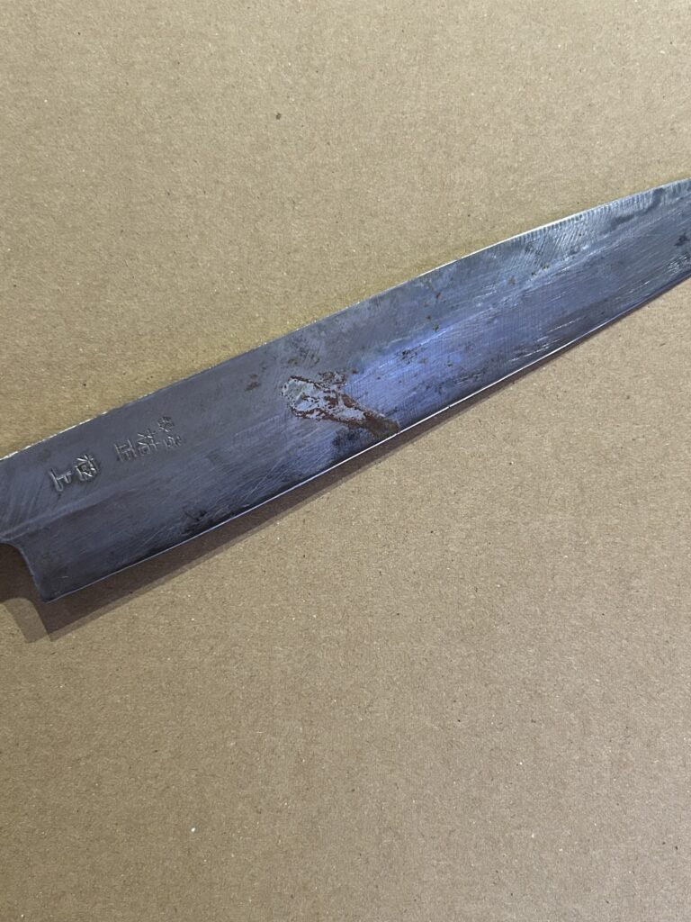 お預かりしたのは、全体的に錆が広がってしまった小さめの柳刃包丁。 通常、切れ味を取り戻すだけなら半日〜1日ほどでお返しできますが、今回はお客様より「錆をしっかり取って、輝き(出来る限りの鏡面仕上げ)を取り戻してほしい」とのご要望をいただきました。